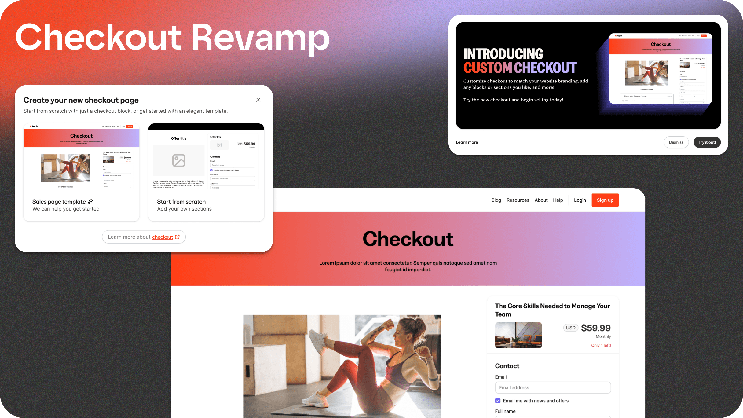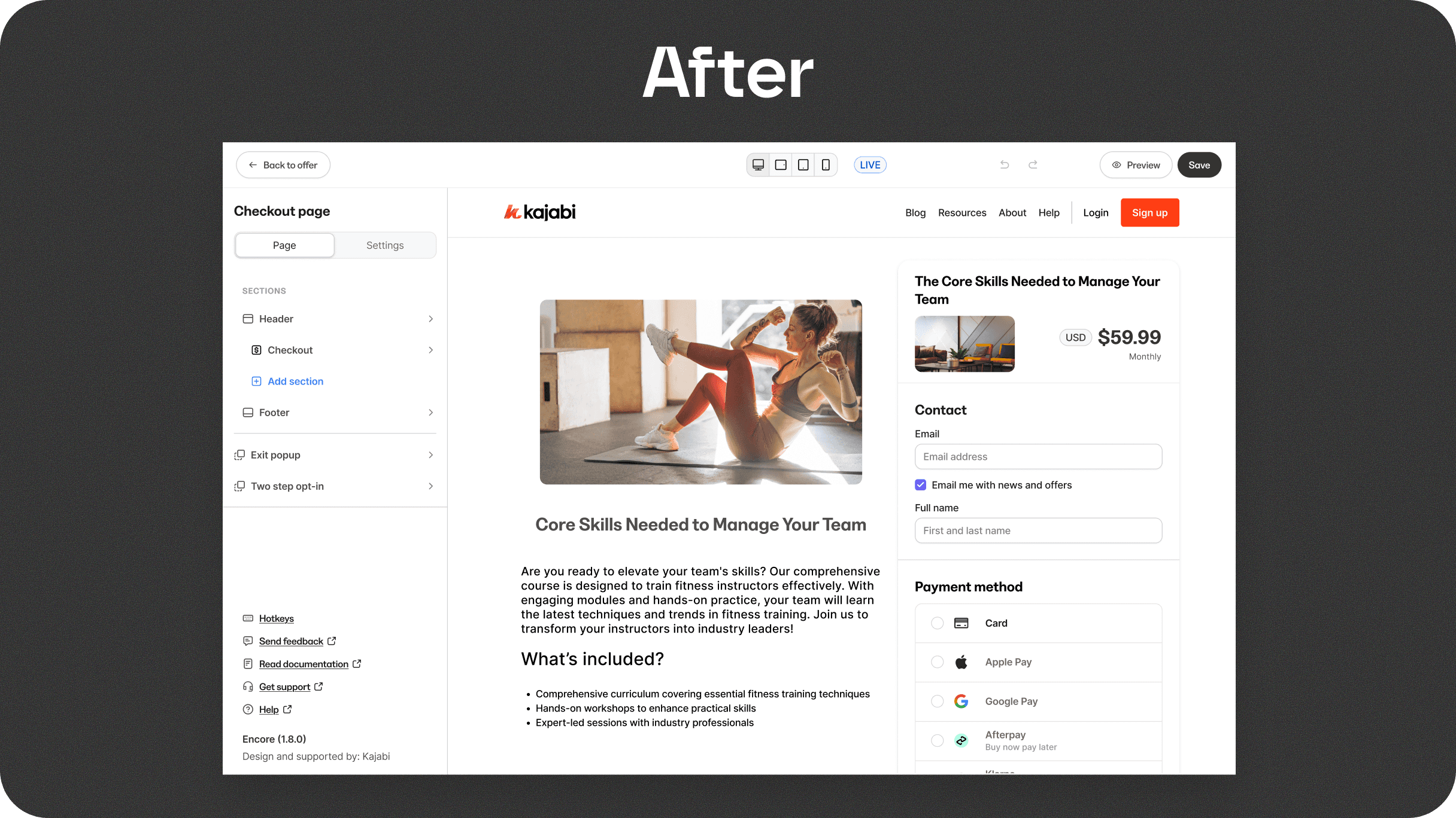 Kajabi is overhauling its checkout experience with customizable themed pages, leverage the improved builder, and an embedded checkout block. These updates respond to user feedback calling for better design, more flexibility, and improve checkout conversion overall.