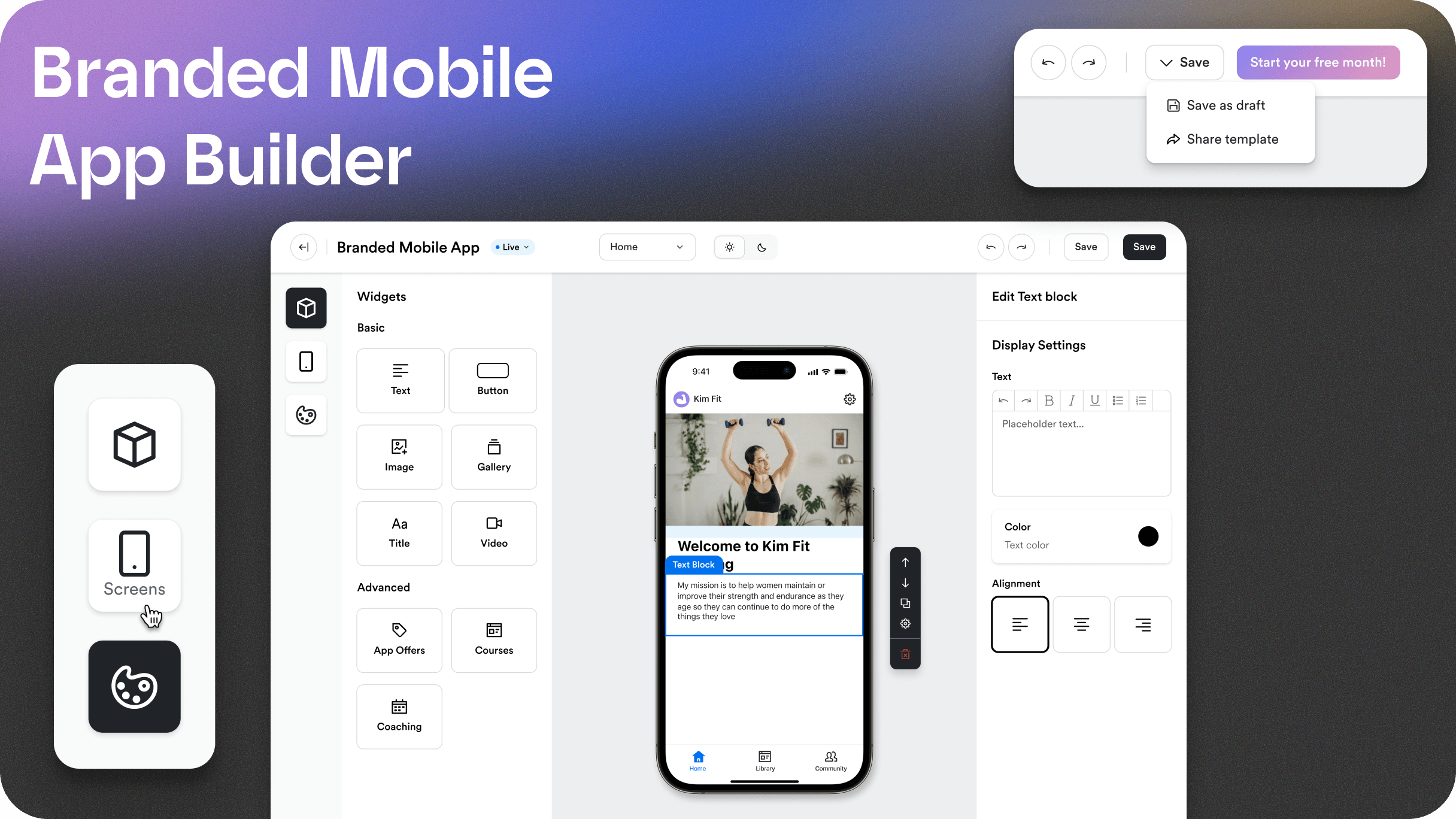 I worked with the monetization PM to put together the end vision and phase 1 of a visual app builder. I paired with our mobile designer in order to combine the mobile and desktop design languages into one seamless experience where customers could see how their branded app would look at a glance. At first, I took inspiration from Wix and how they build out the mobile-version of a website as you go, and as we explored what would mean in Kajabi's landscape, we decided on a full page modal that would more closely resemble our website editor.